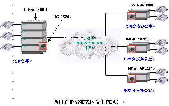 IP分布式體系(IPDA)建于西門子HiPath通信平臺之上,它能解決您的上述煩惱。在各分支辦公室部署HiPath接入點(Access Point)后,同時在集成IP網(wǎng)關(guān)HiPath HG 3500家族的幫助下,HiPath能夠建立起一個將所有分支辦公室包括在內(nèi)的IP通信網(wǎng)絡(luò)。