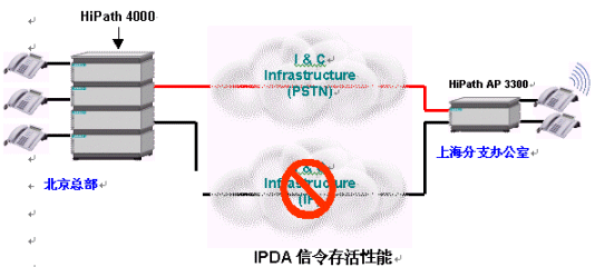 人們也許會問,IP語音(VoIP)是否足夠可靠?如果IP網(wǎng)絡(luò)上的信令通道出現(xiàn)故障,HiPath平臺仍將保證對各接入點的控制,從而提供了可靠的信令存活性能(Signaling Survivability)。在下面的圖例中,當(dāng)企業(yè)IP網(wǎng)絡(luò)出現(xiàn)某些問題后,信令通道轉(zhuǎn)移到了公共交換電話網(wǎng)絡(luò)(PSTN)之上。