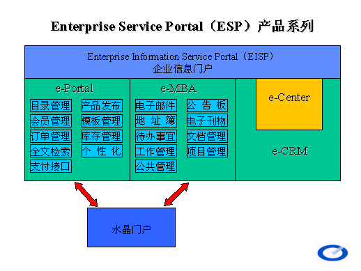 ESP 產(chǎn)品系列關(guān)系如下圖所示,EISP 是瑞尊公司所有應(yīng)用軟件的前端統(tǒng)一界面,e-Portal 、e-MBA 、e-CRM 為在EISP 平臺(tái)下運(yùn)行的具體應(yīng)用系統(tǒng),e-Portal 、e-MBA 兩個(gè)產(chǎn)品合二為一構(gòu)成了針對(duì)中小企業(yè)的普及型產(chǎn)品水晶門戶。