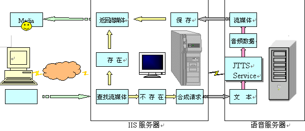 語音服務(wù)器方案是指利用捷通華聲在CTI領(lǐng)域成熟應(yīng)用的jTTS Service語音服務(wù)器,增加一臺或多臺語音服務(wù)器到現(xiàn)有的IIS服務(wù)系統(tǒng)的網(wǎng)絡(luò)環(huán)境中;在IIS服務(wù)器中,增加訪問語音服務(wù)器的功能。當(dāng)IIS服務(wù)器需要流媒體輸出時,向語音服務(wù)器發(fā)出請求,語音服務(wù)器接受IIS服務(wù)器的請求,并對請求的數(shù)據(jù)進(jìn)行合成、格式轉(zhuǎn)換,得到流媒體后返回給IIS服務(wù)器,IIS服務(wù)器再將此流媒體傳輸給用戶。