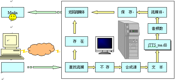 瀏覽器端(Explorer)發(fā)出瀏覽請求,網(wǎng)站服務(wù)器(IIS)根據(jù)請求查找流媒體(音頻流)文件,如有,則將流媒體返回客戶端,并啟動客戶端的MS media player播放流媒體。若沒有,則向語音服務(wù)器(jTTS Service)發(fā)出合成請求,并將所需合成的文本通過Socket接口傳送至語音服務(wù)器;語音服務(wù)器響應(yīng)網(wǎng)站服務(wù)器的合成請求后,將調(diào)用jTTS合成技術(shù)進(jìn)行語音合成,并調(diào)用WMF SDK將生成的音頻文件轉(zhuǎn)換成流媒體格式ASF;通過Socket接口返回IIS服務(wù)器端后,將此流媒體文件存儲到指定的Web目錄,同時將流媒體返回瀏覽器端,啟動MS media player播放。其流程如下: