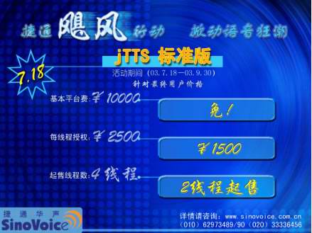 2003年7月18日,北京捷通華聲語音技術有限公司正式發(fā)布捷通華聲語音合成技術 “jTTS標準版”。為慶!癹TTS標準版”的正式上市,為期近三個月,推廣“jTTS標準版”的捷通“颶風行動”也在同一時間正式啟動! 捷通“颶風行動”的宗旨--用全新的產品、全方位的服務、最具競爭力的價格與所有CTI領域的企業(yè)合作,開啟面向中小型CTI系統(tǒng)語音應用的市場大門,為CTI產業(yè)發(fā)展提供持久動力支持!