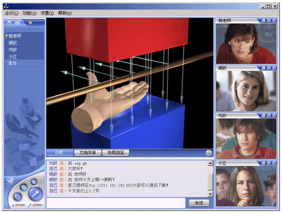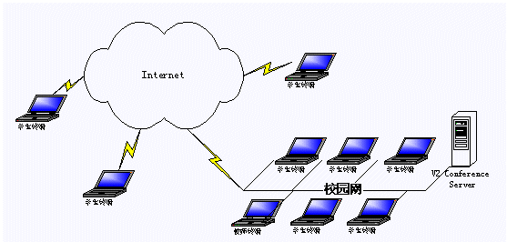 應用V2 遠程教育平臺,教學和遠程培訓都可以在線進行。學生和教師利用各自的客戶端通過網絡,進入一個虛擬課堂,在教師與學生、學生與學生之間建立起語音和視頻的雙向交流、課件教學、在線會話和白板溝通的環(huán)境,實現(xiàn)教學功能。