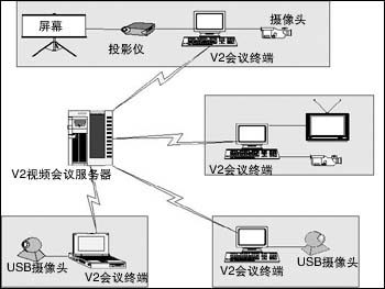 V2 Conference 視頻會議系統(tǒng)是基于MPEG-4標(biāo)準的多媒體壓縮技術(shù),利用IP網(wǎng)絡(luò)開展視頻會議的軟件系統(tǒng)。在從56Kbps撥號到寬帶的網(wǎng)絡(luò)環(huán)境下,用戶利用V2 Conference視頻會議平臺,通過配備普通的PC機、標(biāo)準的音視頻采集和輸出設(shè)備,就可以實現(xiàn)基于Intranet/Internet的虛擬會議。系統(tǒng)不僅可以提供流暢的語音,而且提供清晰流暢的視頻圖像。與傳統(tǒng)的基于硬件的解決方案相比,V2 Conference 是純軟件解決方案。用戶無需投入高昂的成本,就能夠?qū)崿F(xiàn)高質(zhì)量、高可靠性的音視頻通訊、協(xié)同工作、文檔共享、遠程會議管理等多種會議功能,有效地節(jié)約時間和經(jīng)費,提高企業(yè)的工作效率。典型應(yīng)用示意圖