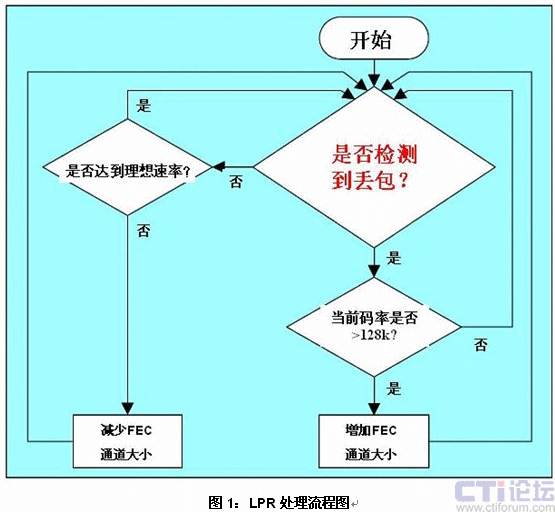 如下面流程圖所示,LPR通過(guò)臨時(shí)將一部分通話帶寬分配給一個(gè)數(shù)據(jù)通道(本文中我們將其簡(jiǎn)稱(chēng)為FEC通道),從而用于發(fā)送FEC數(shù)據(jù)給接收系統(tǒng)來(lái)發(fā)揮作用。通過(guò)一個(gè)循環(huán)處理,LPR會(huì)增加或減少FEC數(shù)據(jù)通道的大小,直到找到必須分配給FEC數(shù)據(jù)通道的最小帶寬,從而使得接收系統(tǒng)能夠恢復(fù)所有丟失的數(shù)據(jù)包。