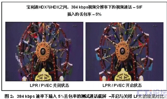 圖2顯示了384 kbps速率視頻通話時(shí),開(kāi)啟和關(guān)閉LPR功能,5%的丟包率所造成的影響對(duì)比。注意左圖中視頻圖像的模糊現(xiàn)象(關(guān)閉LPR / PVEC功能)。右圖中顯示了綜合使用LPR,PVEC和DBA后徹底消除了丟包影響。注意在實(shí)際視頻通話中的圖像失真要比下面左圖靜止圖像所表現(xiàn)的效果還要明顯。