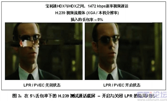 圖3顯示的是對(duì)內(nèi)容和演示數(shù)據(jù)進(jìn)行測(cè)試的結(jié)果,可以看出LPR對(duì)H.239的支持同樣非常出色。開(kāi)啟和關(guān)閉LPR / PVEC時(shí)對(duì)丟包處理的區(qū)別十分明顯。