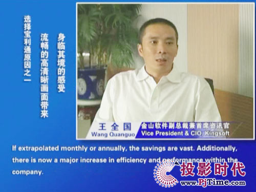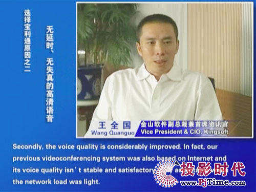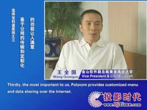 金山軟件副總裁兼首席資訊官王全國先生說道:“對于軟件行業(yè)來說,及時、高效的溝通是保持競爭優(yōu)勢的重要前提。相比之前使用的標清產(chǎn)品,寶利通高清視頻會議系統(tǒng),提供了完全不同的體驗,流暢的高清晰畫面猶如真實的面對面溝通。而且我們公司并沒有申請專線,所有的應用都是基于公網(wǎng)實現(xiàn)的。另一方面,新型全中文定制菜單的運用,令我們使用起來非常方便,這更提高了我們使用視頻通信手段實現(xiàn)異地溝通的熱情。”