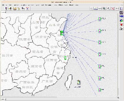 ●網(wǎng)絡(luò)結(jié)構(gòu)和網(wǎng)絡(luò)狀態(tài)總覽:按照網(wǎng)元地理位置提供直觀的網(wǎng)絡(luò)視圖,并通過顏色的變化和圖標的閃爍表示網(wǎng)元的運行狀態(tài)和鏈路的負荷狀況;