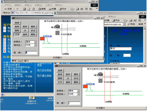 電子白板功能是在語(yǔ)音文字交談之外,ICWEB為用戶提供的圖形交談工具。電子白板允許多個(gè)在線用戶同時(shí)在界面里繪制刪除任意圖形,寫(xiě)字、插入圖片以及用標(biāo)志工具標(biāo)示某些區(qū)域。電子白板功能可以有效地補(bǔ)充文本交談功能所不具備的圖示功能。