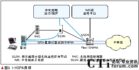 Mb/s為例,一個(gè)1 500個(gè)扇區(qū)的HSDPA網(wǎng)絡(luò)所產(chǎn)生的數(shù)據(jù)量為21.6 Gb/s。目前業(yè)界RNC的數(shù)據(jù)吞吐量?jī)H達(dá)到1 Gb/s。今天各運(yùn)營(yíng)商建設(shè)的3G網(wǎng)絡(luò)與2G共用核心網(wǎng),其帶寬和數(shù)據(jù)處理能力遠(yuǎn)遠(yuǎn)不能滿足HSPA高數(shù)據(jù)率的需求。當(dāng)數(shù)據(jù)負(fù)荷激增時(shí)運(yùn)營(yíng)商將面對(duì)RNC/SGSN的擴(kuò)容的巨大壓力。此外在每一個(gè)節(jié)點(diǎn)處對(duì)數(shù)據(jù)包的重新拆裝會(huì)導(dǎo)致在每一節(jié)點(diǎn)都要引入額外的時(shí)延。結(jié)果會(huì)產(chǎn)生較長(zhǎng)的網(wǎng)絡(luò)時(shí)延。對(duì)于移動(dòng)互聯(lián)網(wǎng)應(yīng)用,這種多層次的網(wǎng)絡(luò)結(jié)構(gòu)是沒(méi)有必要的。使網(wǎng)絡(luò)扁平化不僅可以簡(jiǎn)化設(shè)備降低成本,還可以減少時(shí)延。I-HSPA應(yīng)運(yùn)而生。這種架構(gòu)把基站通過(guò)Gi/Gn口直接連接到GGSN節(jié)點(diǎn)(通向互聯(lián)網(wǎng)和數(shù)據(jù)業(yè)務(wù)的網(wǎng)關(guān))[5]。I-HSPA原理如圖3所示。