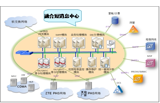 2008年中國(guó)電信收購CDMA移動(dòng)網(wǎng)絡(luò)后,作為全業(yè)務(wù)運(yùn)營(yíng)商的中國(guó)電信再次擴(kuò)大了其業(yè)務(wù)運(yùn)營(yíng)的范疇。CDMA、NGN、PHS,和PSTN四大網(wǎng)絡(luò)的聯(lián)合運(yùn)營(yíng),使網(wǎng)絡(luò)管理的復(fù)雜性日益凸顯。而中國(guó)電信這種多網(wǎng)的運(yùn)營(yíng),更給傳統(tǒng)增值的短消息業(yè)務(wù)的管理帶來困難。如何進(jìn)行多網(wǎng)絡(luò)體制下的業(yè)務(wù)平臺(tái)融合,更高效的開展增值業(yè)務(wù)是電信運(yùn)營(yíng)商目前面臨的重要課題。圖一:中興通訊融合短消息中心系統(tǒng)組成