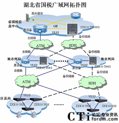 湖北省國(guó)稅三級(jí)專網(wǎng)已經(jīng)建成,但是存在單點(diǎn)單鏈路隱患,為了保證網(wǎng)絡(luò)可靠運(yùn)行,2006年湖北國(guó)稅攜手中興通訊對(duì)省國(guó)稅系統(tǒng)的網(wǎng)絡(luò)進(jìn)行備份網(wǎng)絡(luò)改造,結(jié)合稅務(wù)系統(tǒng)金稅三期網(wǎng)絡(luò)需求,網(wǎng)絡(luò)改造采用SDH線路來組建高帶寬的廣域網(wǎng)絡(luò),同時(shí)與原有的網(wǎng)絡(luò)設(shè)備(包括路由器、交換機(jī))及網(wǎng)絡(luò)接入設(shè)備實(shí)現(xiàn)互連互通,互為備份。
