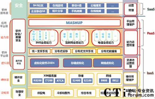 根據(jù)產(chǎn)品特性,中興通訊云計算架構細分為硬件層、虛擬層、軟件平臺層、能力層、 應用平臺以及軟件服務層,對應經(jīng)典云計算架構中IaaS、PaaS、SaaS三層服務。