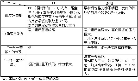聯(lián)想長期構(gòu)筑的、在中國PC制造業(yè)的核心競爭力,正受到戴爾的巨大威脅,導(dǎo)致聯(lián)想開始轉(zhuǎn)而采用戴爾的按客戶需求定制、直接銷售的模式,希望建立新的核心競爭力,再度引領(lǐng)中國PC產(chǎn)業(yè)。IT制造業(yè)的巨變,戴爾的成功給陷于低層次競爭的家電產(chǎn)業(yè)很大的啟發(fā),曾經(jīng)鑄造中國家電企業(yè)輝煌的核心競爭力急需注入新的生命力,以適應(yīng)新的競爭形勢。計(jì)算機(jī)技術(shù)、互動(dòng)通信技術(shù)的進(jìn)步以及互聯(lián)網(wǎng)的出現(xiàn)使企業(yè)能夠建立與用戶之間一對一的密切客戶關(guān)系,使服務(wù)創(chuàng)造價(jià)值,IT技術(shù)推動(dòng)技術(shù)、產(chǎn)品、生產(chǎn)、銷售和營銷的發(fā)展,支撐家電企業(yè)建立新的核心競爭力。在同質(zhì)化競爭的環(huán)境下,家電企業(yè)也許更應(yīng)該從服務(wù)、營銷、銷售方面來建立自己的核心競爭力。海爾就是典型的例子,海爾的發(fā)展與它完善的服務(wù)體系和服務(wù)制度是分不開的。聚焦于服務(wù)、營銷、銷售的客戶關(guān)系管理(CRM)系統(tǒng)讓家電企業(yè)看到了新的希望?梢灶A(yù)言,CRM將為家電業(yè)點(diǎn)燃一盞新啟航燈。