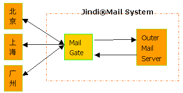 如果選用Jindi MailServer作為外部郵件服務(wù)器,可以在同一臺(tái)外部郵件服務(wù)器上配置可選的MailGate模塊,該模塊可以將指定域用戶的郵件進(jìn)行定向投遞,而不依賴DNS的配置。內(nèi)部郵件通過內(nèi)部DNS在郵件網(wǎng)關(guān)處進(jìn)行存儲(chǔ)轉(zhuǎn)發(fā)到外部。