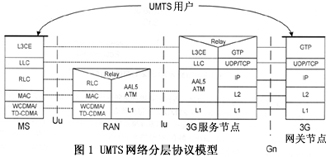 對(duì)圖1的簡(jiǎn)要描述如下:移動(dòng)用戶(MS)到RAN左側(cè)部分是無(wú)線接入網(wǎng)絡(luò)的無(wú)線用戶接口(Uu),實(shí)現(xiàn)了用戶業(yè)務(wù)通過空中無(wú)線鏈路接入3G網(wǎng)絡(luò)的功能,主要包含物理層(采用WCDMA和TD-CDMA技術(shù))、媒體接入層(MAC)、無(wú)線鏈路層(RLC);在RAN內(nèi)部通過協(xié)議中繼(Relay)實(shí)現(xiàn)無(wú)線鏈路和有線鏈路的對(duì)接;在RAN和3G服務(wù)節(jié)點(diǎn)之間的接口(Iu)是以ATM技術(shù)為支撐的有線接入段協(xié)議,為支持Internet業(yè)務(wù),采用AAL5適配層協(xié)議,物理層(L1)無(wú)明確限定具體傳輸方式;在此之上,透過RAN、MS和3G服務(wù)節(jié)點(diǎn)之間存在兩個(gè)高層連接,即邏輯聯(lián)絡(luò)層(LLC)和更為復(fù)雜的第三層實(shí)體(L3CE),L3CE是一些以Client/Server方式構(gòu)件的軟件實(shí)體,實(shí)現(xiàn)諸如無(wú)線資源管理、呼叫控制、移動(dòng)管理等網(wǎng)絡(luò)級(jí)功能;在3G服務(wù)節(jié)點(diǎn)內(nèi)部,為實(shí)現(xiàn)到Internet網(wǎng)絡(luò)的接入,再作一次協(xié)議中繼,這里,第三層實(shí)體的信息映射到通用分組無(wú)線服務(wù)的隧道協(xié)議GTP(GPRS Tunneling Protocol);3G服務(wù)訪問點(diǎn)到3G網(wǎng)關(guān)之間的Gn接口存在清晰的、以TCP/IP協(xié)議為主體的五層對(duì)應(yīng)關(guān)系;構(gòu)建在最上層的是移動(dòng)用戶到3G網(wǎng)關(guān)的UMTS用戶進(jìn)程,它通過3G網(wǎng)關(guān)進(jìn)入Internet骨干網(wǎng),最終實(shí)現(xiàn)用戶對(duì)Internet的訪問。