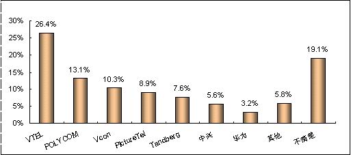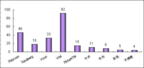 各品牌的認知度與其市場銷售情況息息相關。例如,VTEL是最早進入中國市場的視頻會議廠商,并在相當長的時期內(nèi)占據(jù)市場領先地位,取得顯著的品牌認知度是有其廣泛用戶基礎作為支撐的;POLYCOM雖然從1998年才開始進軍中國市場,但在基于IP的視頻會議系統(tǒng)的市場爭奪中取得較好的成績;PictureTel已經(jīng)被POLYCOM收購,品牌認知度也相對較低;而國內(nèi)品牌中興、華為剛剛起步,也很難達到較高的認知度。