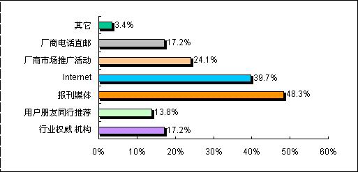 此次調(diào)查顯示,由于視頻會議系統(tǒng)的行業(yè)性相對較強,目前用戶在了解視頻終端會議系統(tǒng)產(chǎn)品時,報刊媒體、Internet、廠商推廣活動、廠商電話直郵和行業(yè)權威機構成為主要的信息來源渠道。值得注意的是網(wǎng)絡的普及使得更多的用戶也選擇Internet作為了解信息的重要途徑。但對各視頻會議系統(tǒng)的廠商而言,由于客戶群體相對龐大,分散區(qū)域較為廣泛,在作好直銷的同時,也應該加強渠道的建設,以更及時和準確地了解到用戶采購和招標的信息,同時也能夠降低銷售成本。