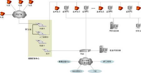 系統(tǒng)的核心是話路語音中心,主要實現兩大功能: 一是實現180系統(tǒng)的話路語音平臺; 二是實現與電話網絡的接口。以1臺Pentium級工控機作為處理平臺,2塊30線數字中繼語音處理卡,1塊帶振鈴器的24線模擬座席電話轉接卡,1塊4路傳真卡,卡間以語音處理行業(yè)的標準總線SC總線相連。系統(tǒng)與電信網絡的接口采用E1數字中繼線,信令方式采用中國一號信令為隨路信令,工控機用TCP/IP協議與局域網相連。