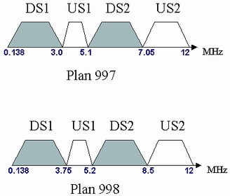 此標(biāo)準(zhǔn)從中國的實(shí)際情況出發(fā),既適應(yīng)接入網(wǎng)絡(luò)總體流量的非對(duì)稱特性,又考慮滿足一些對(duì)上行速率要求較高、接近對(duì)稱的業(yè)務(wù)需求;既考慮當(dāng)前技術(shù)和設(shè)備狀況,又兼顧未來技術(shù)發(fā)展和一段時(shí)期內(nèi)可能的業(yè)務(wù)需求,提出了中國的VDSL頻段劃分方式。這種方式在Plan998
