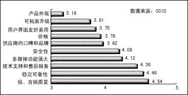 CCID對視頻會議現(xiàn)狀調(diào)查結(jié)果顯示,與以往相比,用戶對視頻會議終端系統(tǒng)的選擇標(biāo)準(zhǔn)已經(jīng)發(fā)生了變化。用戶除了一如既往地要求很好的音視頻質(zhì)量外,對產(chǎn)品的穩(wěn)定可靠性、技術(shù)支持和售后服務(wù)、多媒體功能、安全性四項(xiàng)也有要求。其中,用戶對視頻會議終端系統(tǒng)的多媒體功能和設(shè)備的可拓展升級提出了更高的要求,而不再局限于視音頻質(zhì)量和穩(wěn)定、可靠性上,對多媒體功能的需求在不斷地增長。更多的用戶不僅把會議系統(tǒng)用于視音頻開會,更將視頻會議的多媒體功能作為采購的重要指標(biāo)之一。