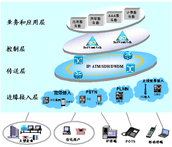 d)邊緣接入層:由各類(lèi)媒體網(wǎng)關(guān)和綜合接入設(shè)備(IAD)組成,通過(guò)各種接入手段將各類(lèi)用戶(hù)連接至網(wǎng)絡(luò),并將信息格式轉(zhuǎn)換成為能夠在分組網(wǎng)絡(luò)上傳遞的信息格式。