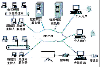 隨著全球步入信息化時(shí)代,人們對(duì)信息的交換要求已經(jīng)從紙、筆、話音等發(fā)展到使用視訊多媒體技術(shù),使得交流更準(zhǔn)確、更快捷、更豐富。在需求的推動(dòng)下,多媒體計(jì)算機(jī)技術(shù)與通信技術(shù)相結(jié)合,逐漸發(fā)展成為一種新的邊緣技術(shù)——視頻多媒體通信技術(shù)。視頻多媒體通信技術(shù)主要應(yīng)用在以下幾個(gè)領(lǐng)域: 視頻會(huì)議、可視電話、遠(yuǎn)程教育、遠(yuǎn)程醫(yī)療、遠(yuǎn)程監(jiān)控等。視頻通信能為用戶提供直接、全面的溝通交流方式,并能節(jié)約時(shí)間、降低成本、提高生產(chǎn)率,巨大的市場(chǎng)需求推動(dòng)了視頻會(huì)議技術(shù)的發(fā)展。今天,基于各自特點(diǎn)與需求的視頻通信系統(tǒng)在各行各業(yè)已廣泛應(yīng)用。圖1 視頻會(huì)議系統(tǒng)網(wǎng)絡(luò)結(jié)構(gòu)圖