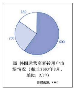 彩鈴業(yè)務(wù)最先是由韓國的SK電信于2002年3月推出的,業(yè)務(wù)一經(jīng)面世就吸引了移動用戶、特別是年青用戶群體的眼球,開通的用戶數(shù)和業(yè)務(wù)使用率呈指數(shù)式增長;同時由彩鈴業(yè)務(wù)帶來的互聯(lián)網(wǎng)、WAP和IVR的話務(wù)量的增長進(jìn)一步提升了彩鈴業(yè)務(wù)的含金量。隨后韓國的其他兩個移動運營商LG電信和韓國電信也分別于2002年6月和9月相繼開通彩鈴業(yè)務(wù)。經(jīng)過運營商和彩鈴的內(nèi)容提供商的前期市場推廣和運作,目前已發(fā)展了近1000萬用戶,其中運營商的市場份額如圖所示。