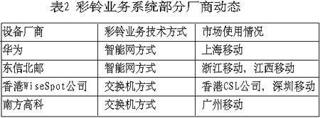 目前市場上有技術(shù)能力提供彩鈴業(yè)務(wù)系統(tǒng)的廠商主要有韓國的設(shè)備商Witcom和 OnionTech21,以及其他國外廠商如Comverse和WiseSpot,國內(nèi)廠商有華為、中興、南方高科、東信北郵等。各廠商都在和移動運營商合作部署其彩鈴業(yè)務(wù)系統(tǒng),力爭成為市場的領(lǐng)先者,如華為在上海移動建設(shè)了其智能網(wǎng)方式的彩鈴業(yè)務(wù)系統(tǒng),通過其原有的智能網(wǎng)系統(tǒng)的更新升級實現(xiàn)彩鈴業(yè)務(wù),F(xiàn)在已有確切消息證實,彩鈴業(yè)務(wù)將于今年10月1日起正式商用,同時進(jìn)入商用的還有北京移動的彩鈴業(yè)務(wù)。與此同時,東信北郵也與浙江移動、江西移動合作開通彩鈴業(yè)務(wù),于2003年3月25日彩鈴業(yè)務(wù)通過現(xiàn)網(wǎng)實用測試。