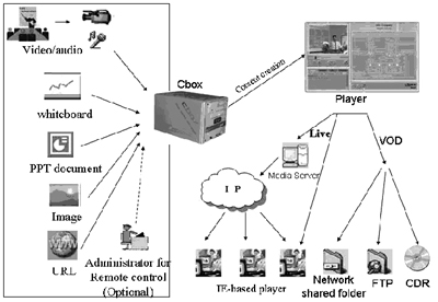 通過Cbox系統(tǒng),稅務(wù)局培訓(xùn)中心的講師只需預(yù)先將各種PowerPoint和圖片文件提供給Cbox,然后按照正常進度進行教學(xué)。Cbox可以自動將攝像頭和麥克風(fēng)采集的講師的音視頻信號、白板信號、PowerPoint文檔前進、后退、圖片和Internet資源URL進行精確同步,制作出包含多種格式數(shù)據(jù)的數(shù)據(jù)流,然后以直播或點播的方式發(fā)布。用戶可以在自己的PC終端上通過IE瀏覽器同步觀看直播內(nèi)容,或者通過下載LAN共享目錄、FTP上的文件來觀看教學(xué)內(nèi)容。如果沒有網(wǎng)絡(luò)環(huán)境,還可以通過刻錄光盤后分發(fā)將培訓(xùn)內(nèi)容傳遞。而且因為只需Windows媒體播放機和IE瀏覽器就可正常播放,所以可以降低客戶端軟件安裝調(diào)試的工作量和費用。系統(tǒng)中還有可供選擇的助教,他只需使用普通PC和IE瀏覽器,在講師不方便控制PowerPoint文檔等內(nèi)容的情況下,幫助講師完成相應(yīng)操作。另外一個可選的流媒體服務(wù)器,是用來支持大量用戶同時直播、點播需求。