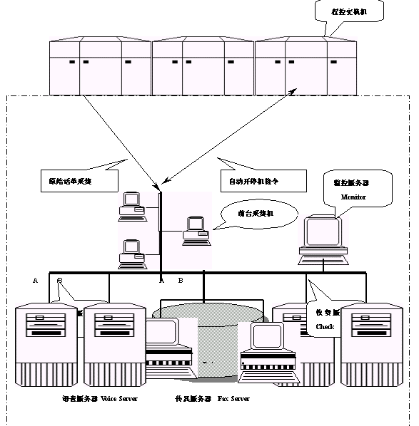 本系統(tǒng)可以分為:話單采集傳輸子系統(tǒng)、計(jì)費(fèi)帳務(wù)處理子系統(tǒng)、收費(fèi)服務(wù)子系統(tǒng)、語音查詢充值子系統(tǒng)、自動開停機(jī)子系統(tǒng)和監(jiān)控服務(wù)子系統(tǒng)六個(gè)模塊。