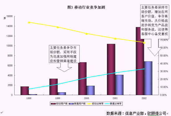 拿移動(dòng)通訊業(yè)務(wù)來說,如圖3所示,截至到2002年底,中國(guó)移動(dòng)的市場(chǎng)份額大約在65%,而聯(lián)通為35%左右,網(wǎng)絡(luò)覆蓋以及質(zhì)量也越來越趨同。從國(guó)內(nèi)國(guó)外的經(jīng)驗(yàn)來看,移動(dòng)通訊市場(chǎng)的競(jìng)爭(zhēng)正從爭(zhēng)奪市場(chǎng)份額轉(zhuǎn)變?yōu)楸3质袌?chǎng)份額和增加客戶價(jià)值,而主要手段正也從網(wǎng)絡(luò)建設(shè)、營(yíng)銷渠道建設(shè)、價(jià)格戰(zhàn)等轉(zhuǎn)變?yōu)楫a(chǎn)品戰(zhàn)和服務(wù)戰(zhàn)。在這個(gè)階段,兩家主要的運(yùn)營(yíng)公司都對(duì)客戶服務(wù)非常重視。服務(wù)水平的達(dá)標(biāo),投訴流程的梳理,呼叫中心的擴(kuò)大規(guī)模,電話營(yíng)業(yè)廳的建設(shè)等工作是今年的重點(diǎn)。