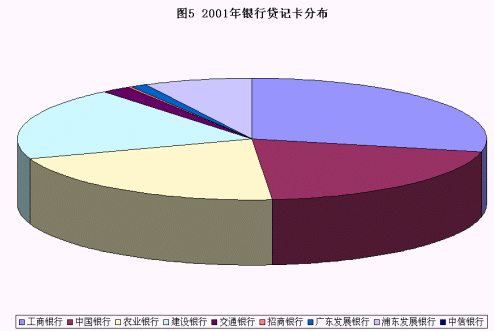 以貸記卡(含信用卡)的發(fā)展舉例:四大國(guó)有銀行在2001年還占據(jù)了絕大部分的份額(圖5是2001年貸記卡的分布)。而從2002的下半年起,深圳發(fā)展銀行、招商銀行陸續(xù)推出了頗具市場(chǎng)競(jìng)爭(zhēng)力的信用卡,廣東發(fā)展銀行等老發(fā)卡行也推出獨(dú)特的女性專用"真情卡"等個(gè)性化產(chǎn)品,對(duì)整個(gè)市場(chǎng)有著很大的沖擊。在信用卡發(fā)卡量迅速提升的情況下,工商銀行2002年貸記卡的數(shù)量比前一年減少了160萬張,這也說明了市場(chǎng)競(jìng)爭(zhēng)的殘酷。