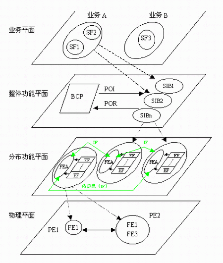 在上圖1中, SF—業(yè)務屬性;BCP—基本呼叫處理;SIB—業(yè)務無關(guān)構(gòu)筑塊;FE—功能實體; FEA—功能實體動作;FE—物理實體;POI—起始點;