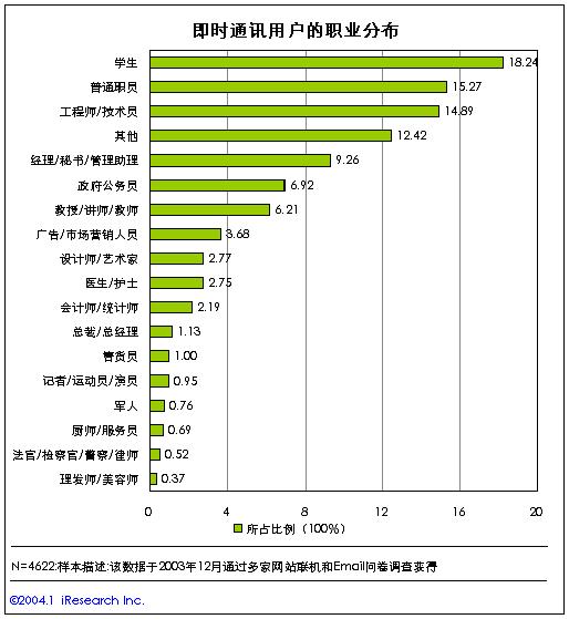 從即時通訊用戶的職業(yè)結(jié)構(gòu)來看,在中國的即時通訊用戶中,學(xué)生、普通公司職員、工程技術(shù)人員構(gòu)成了最主要的用戶群體,其中學(xué)生的比例最高,達(dá)到了18.24%。看開學(xué)生是中國即時通訊的生力軍。