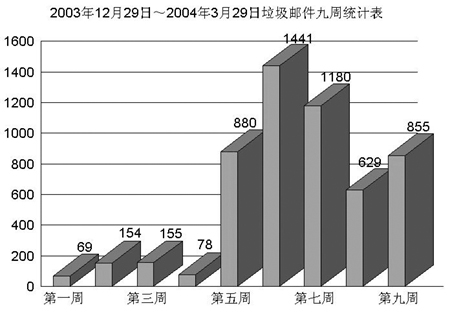 出于為反垃圾郵件產(chǎn)品評(píng)測(cè)積累樣本的目的,記者于2003年12月在“計(jì)算機(jī)世界網(wǎng)”上張貼了一個(gè)誘餌信箱,令人吃驚的是,僅僅在誘餌信箱發(fā)布后不到5分鐘,第一封垃圾郵件就不期而至。自從該誘餌信箱發(fā)布以來,其垃圾郵件的數(shù)量增長(zhǎng)情況如上圖所示。
