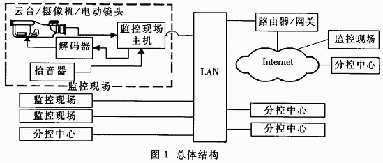 遠(yuǎn)程監(jiān)控系統(tǒng)一般包括三部分:前端監(jiān)控現(xiàn)場、通信設(shè)備和后端分控中心。整個(gè)系統(tǒng)基于Client/Server(客戶機(jī)/服務(wù)器)模式?傮w結(jié)構(gòu)如圖1所示。