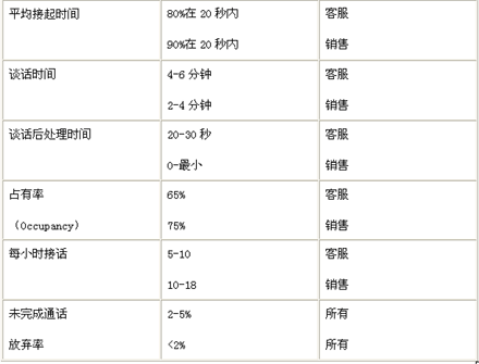 呼叫中心管理需要大量的量化指標。這些指標應當參照別人的經(jīng)驗,但絕對沒有拿來就用的“基本標準”。常用的有以下一些: