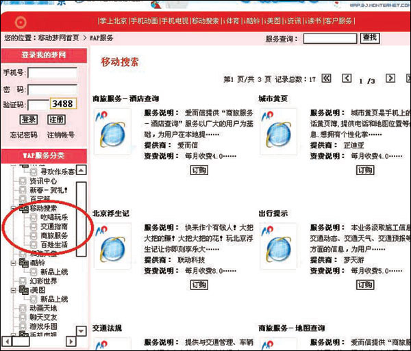 移動搜索業(yè)務到底有哪些變種?出現(xiàn)在移動終端上的搜索引擎與基于Web頁面瀏覽的搜索引擎有什么不同?移動搜索的前景如何?帶著這些問題,本報記者走訪了國內(nèi)移動搜索領(lǐng)域的從業(yè)者,并在終端用戶那里得到了各種反饋聲音。圖1 移動運營商網(wǎng)站上列出的移動搜索業(yè)務分類