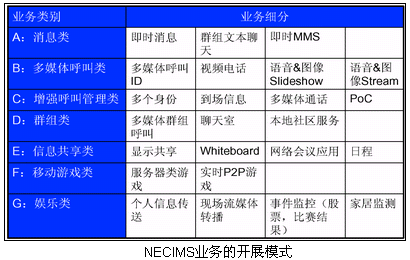 NEC的IMS系統(tǒng)已經(jīng)可以在SIP終端上實現(xiàn)這些業(yè)務:PoC(手機一鍵通)、聊天、在線游戲、IM(即時消息)、Presence、多媒體呼叫、流媒體應用和視頻消息等業(yè)務。