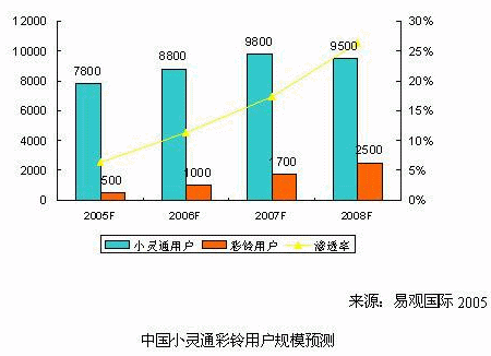 亞太領(lǐng)先的高科技智囊機(jī)構(gòu)-易觀國際最新推出的《固網(wǎng)增值業(yè)務(wù)研究系列報(bào)告-彩鈴彩話2005》中,易觀預(yù)測,2005年國內(nèi)小靈通彩鈴用戶總數(shù)將達(dá)到500萬戶,市場規(guī)模為1.7億元人民幣;到2008年,小靈通彩鈴用戶有望達(dá)到2,500萬戶,市場規(guī)模將超過21億元人民幣。