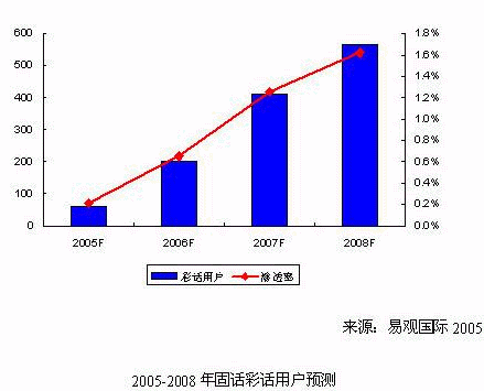 《固網(wǎng)增值業(yè)務(wù)研究系列報(bào)告-彩鈴彩話2005》中易觀國際認(rèn)為,固話彩話業(yè)務(wù)將難以像小靈通彩鈴那樣得到廣泛的應(yīng)用,但是能夠在細(xì)分市場中滿足固話用戶的個(gè)性化需求。易觀國際預(yù)測,2005年國內(nèi)固話彩話用戶總數(shù)將達(dá)到60萬戶,市場規(guī)模為1,000萬元人民幣;到2008年,固話彩話用戶超過550萬戶,市場規(guī)模將超過1.7億元人民幣。