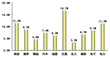 2005年中國(guó)主要行業(yè)的大型用戶呼叫中心需求比例平均為8.5%。其中需求比例較高的行業(yè)有交通、政府、電力,這些行業(yè)大型用戶呼叫中心需求比例超過(guò)了10%。另外,煙草、汽車制造、流通和鋼鐵企業(yè)呼叫中心需求大致在7%~8%左右。物流行業(yè)和化工企業(yè)需求比例較低。