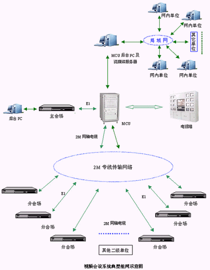 系統(tǒng)在采用E1/G.703接口,每個分會場用一個2M傳輸?shù)那闆r下,單級MCU最多支持96個會場組網(wǎng),兩級MCU最多可達(dá)552個會場組網(wǎng)。