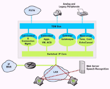 IP Enabled類IP-PBX的核心交換還是基于64K的傳統(tǒng)TDM交換網(wǎng)絡,由一條傳統(tǒng)TDM BUS進行控制,IP業(yè)務的支持需外接網(wǎng)關(可為內置插板或外置模塊),其優(yōu)點與傳統(tǒng)TDM