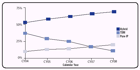 Pure IP類IP-PBX的核心交換和控制基于寬帶IP總線(Switched IP Core),其優(yōu)點是與數(shù)據(jù)網(wǎng)絡基礎設施的無縫結合,同時,支持所有VoIP業(yè)務,而且在功能的透明性,使用的流暢性等諸多方面十分完美。但其缺點也十分明顯,如對傳統(tǒng)TDM業(yè)務(如模擬話機接口,E&M接口等)的支持也不得不借助外置網(wǎng)關來實現(xiàn),一般來講就是在路由器上加插一些語音卡,但如此一來,路由器的性能,路由能力都會明顯下降,而且當用戶傳統(tǒng)TDM業(yè)務需求量較大時,網(wǎng)關將會變得十分龐大,造價也會高的嚇人。此外,由于此類PBX多為數(shù)據(jù)網(wǎng)絡公司為填補其在語音產(chǎn)品上的空白而設計推出的,其產(chǎn)品的語音功能在操作性,專業(yè)性,人性化等方面與那些從事語音產(chǎn)品多年,積累和沉淀了大量經(jīng)驗的傳統(tǒng)TDM