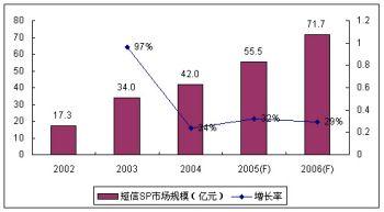 繼2004年中國政府和運(yùn)營商監(jiān)管力度的加大,2005年的短信SP市場規(guī)模增長率為32%,SP市場規(guī)模55.5億元,比2004年略有上升。基于目前短信市場增量市場的縮小,其增長主要依靠對存量市場需求的深度挖掘。諾盛預(yù)計(jì)2006年的短信市場繼續(xù)保持平穩(wěn)的增長勢頭,增長率將達(dá)29%。