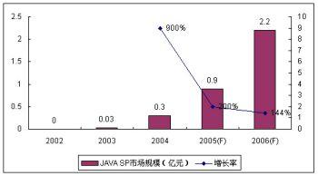 作為SP和移動(dòng)運(yùn)營商都非常看好的業(yè)務(wù),JAVA業(yè)務(wù)受到眾多SP的青睞。盡管作為JAVA主要業(yè)務(wù)的手機(jī)游戲目前盈利狀況普遍欠佳,但空中網(wǎng)、美通無線、數(shù)字魚等SP仍然大量投入,期待著未來業(yè)務(wù)的高速增長。受制于終端和JAVA游戲的表現(xiàn)力,2005年JAVA業(yè)務(wù)的SP市場規(guī)模增長率回落到200%,諾盛預(yù)計(jì)2006年JAVA的使用環(huán)境沒有太大變化,其增長率進(jìn)一步回落至144%。