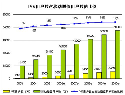 根據(jù)iResearch統(tǒng)計(jì)數(shù)據(jù),2005年中國(guó)IVR用戶規(guī)模為2300萬(wàn),增長(zhǎng)率達(dá)到64%。預(yù)計(jì)2010年IVR用戶數(shù)將接近9000萬(wàn),2006~2010年復(fù)合增長(zhǎng)率為30.2%。2005年IVR業(yè)務(wù)的知曉度不高,滲透率非常低,只有8%。預(yù)計(jì)在2006年將達(dá)到10%,遠(yuǎn)遠(yuǎn)低于短信和彩信的業(yè)務(wù)滲透率,仍有較大的發(fā)展空間。